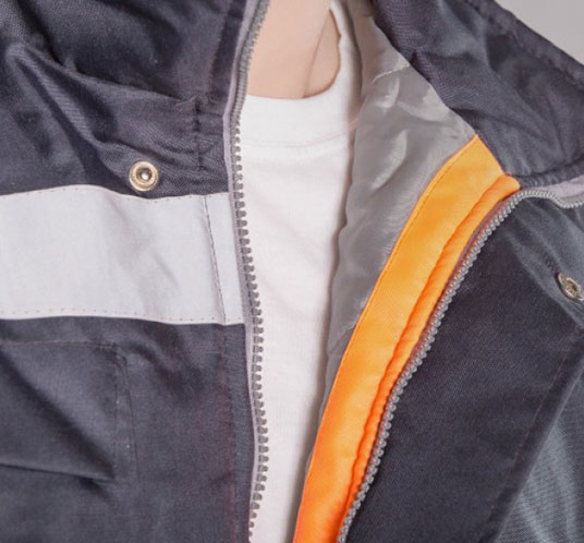 Cierre reforzado diente de perro. Interior de tafeta gris. Botamangas con cierre. Capucha desmontable. Abrigo 180 gr. matelaseado. Cinta reflectiva en espalda.